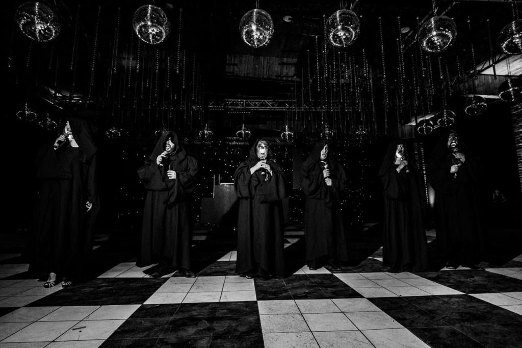 Impacta desde el misterio con una entrada teatral inesperada y visualmente potente,aparecen de entre medio de los invitados, artistas vestidos con sotanas negras y sus rostros iluminados.